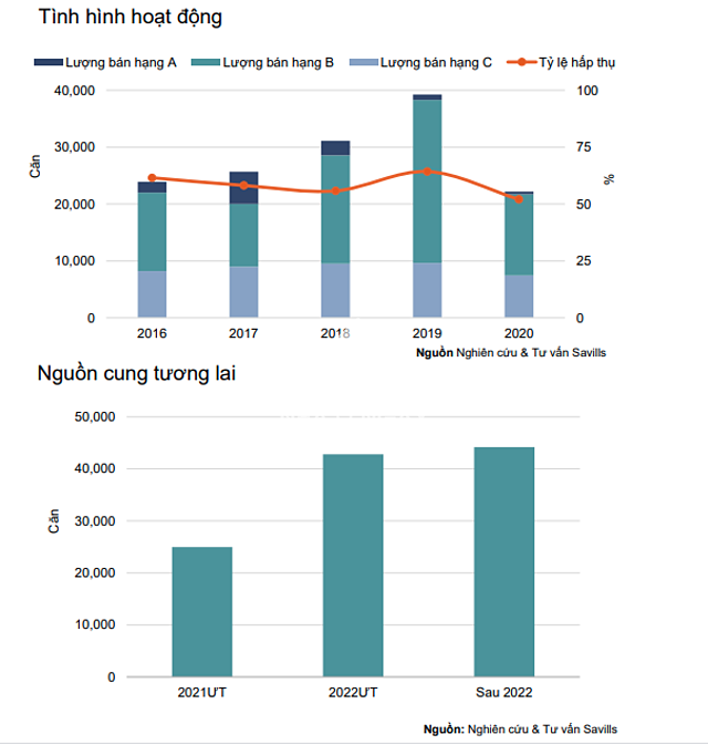 Nhu cầu bị dồn nén đã thúc đẩy hoạt động thị trường căn hộ. Tổng số căn hộ bán đạt gần 6.700 căn, tăng 27% theo quý với tỷ lệ hấp thụ đạt 25%, tăng 5 điểm % theo quý. Tuy nhiên, do chịu ảnh hưởng của đại dịch Covid-19, số lượng căn bán giảm 43% theo năm, xuống mức thấp nhất trong vòng 5 năm vừa qua. Phân khúc căn hộ Hạng B và C hoạt động tốt. Trong đó, hạng B với 64% thị phần duy trì là phân khúc dẫn đầu.