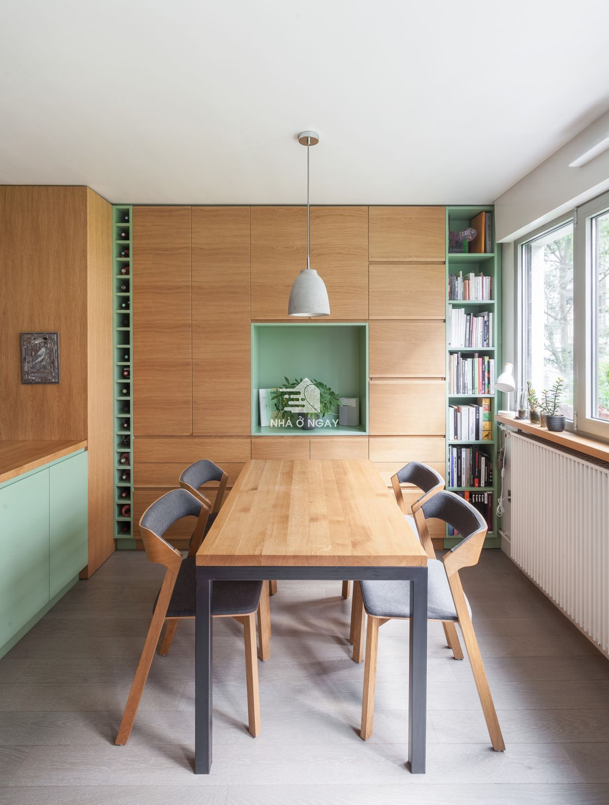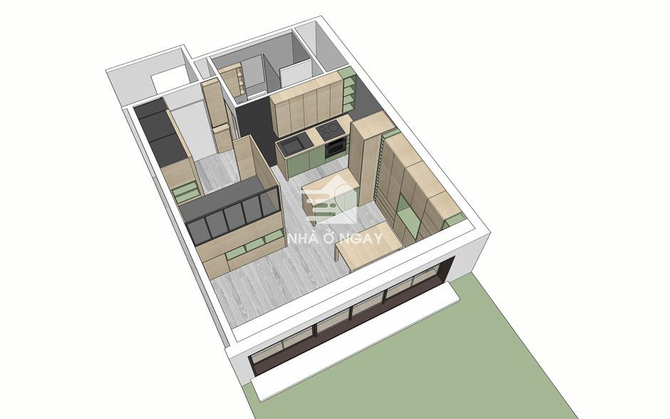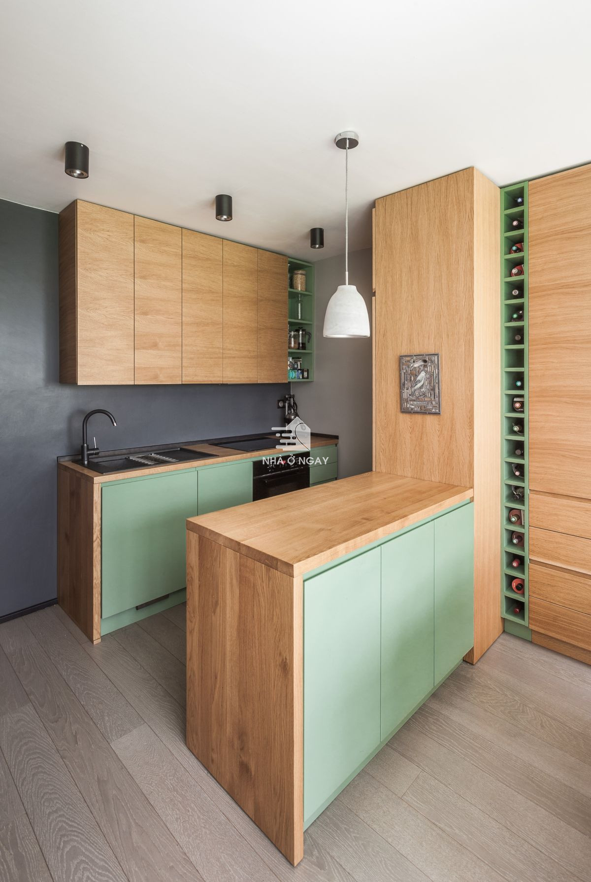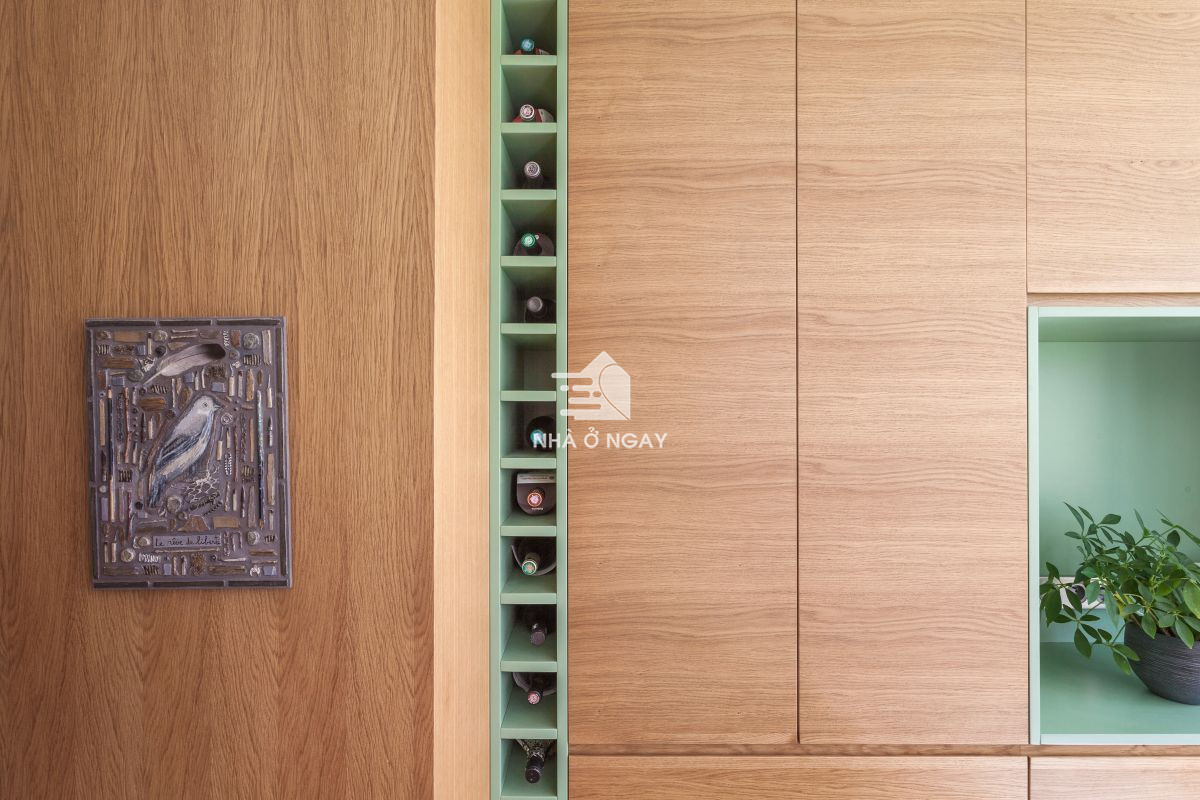 Toàn bộ các góc chức năng đều được sử dụng gỗ sồi với gam màu tươi sáng. Những điểm nhấn nhẹ nhàng từ màu xanh lá tạo cảm giác thư thái, gần gũi với thiên nhiên. Hai gam màu khi kết hợp với nhau còn tạo nên trực quan về thẩm mỹ hài hòa, thoáng đãng.