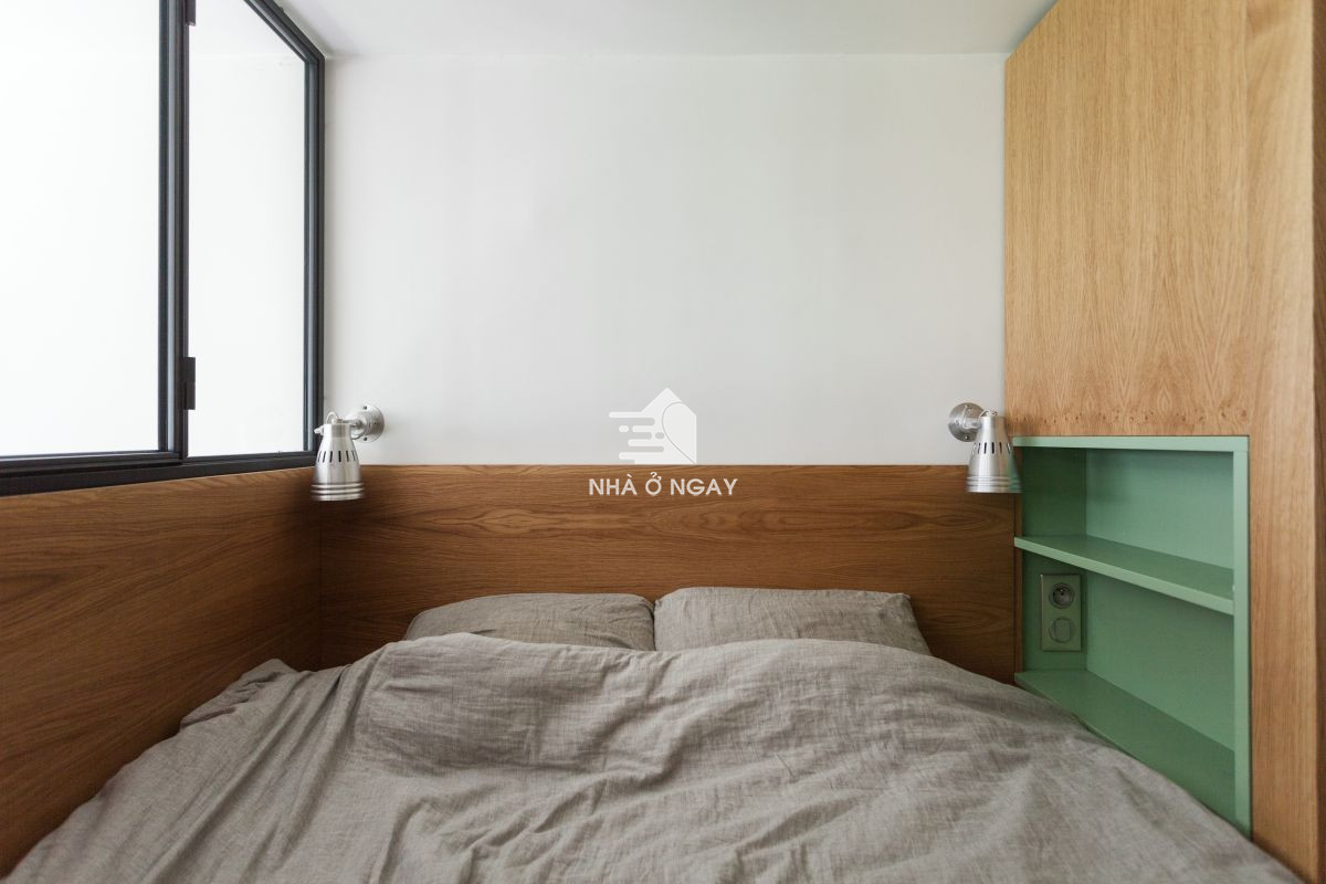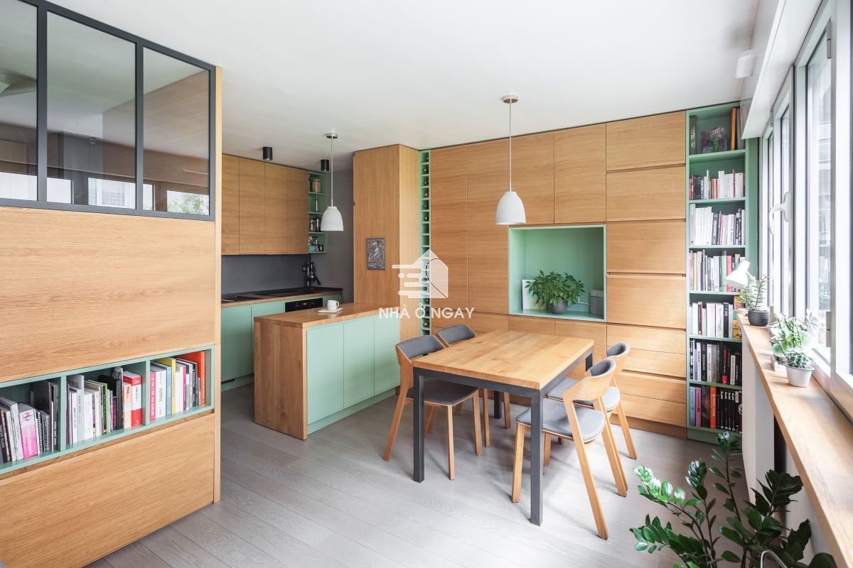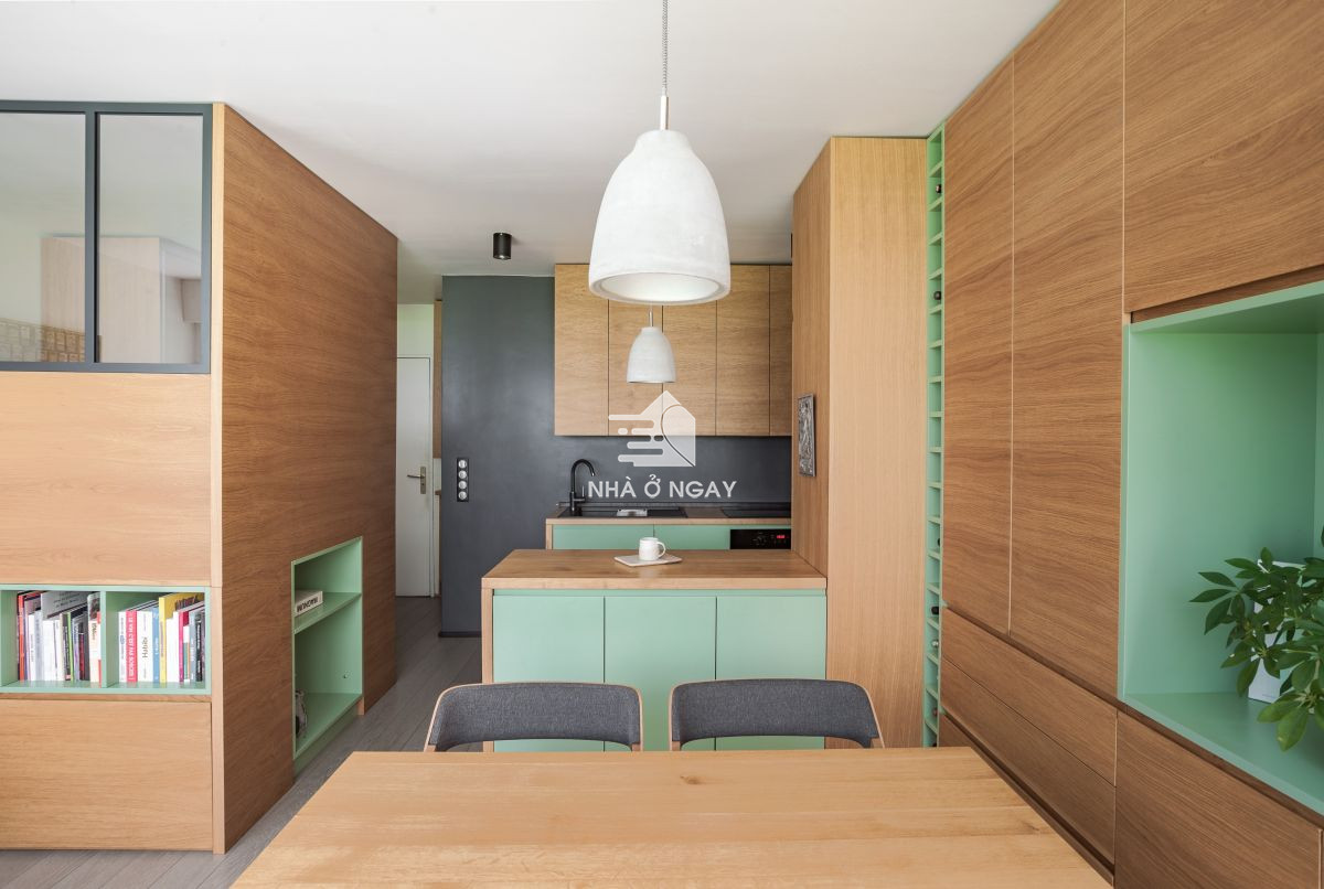 Các bức tường đều được thiết kế hệ thống kệ, tủ linh hoạt, kết hợp màu gỗ sồi cùng với màu xanh lá cây. Căn phòng không chỉ được decor khéo léo với nội thất mà còn tạo độ thẩm mỹ vô cùng tinh tế giúp không gian rộng rãi dù có hạn chế về diện tích.