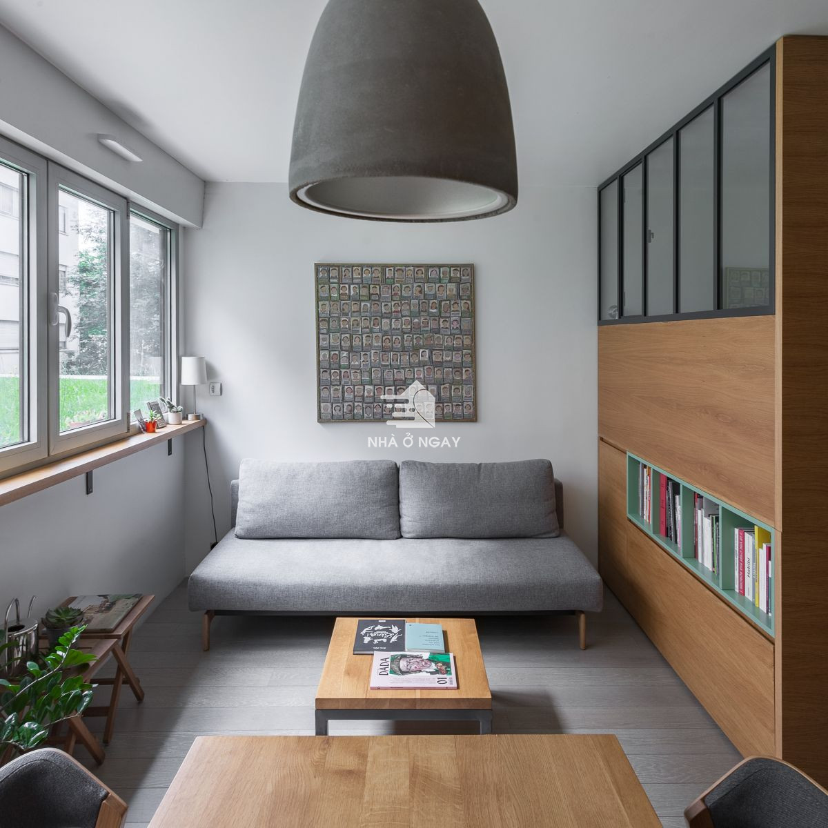 Khu vực tiếp khách được bố trí gọn gàng với sofa giường, bàn trà nhỏ xinh nhiều ánh sáng tự nhiên.