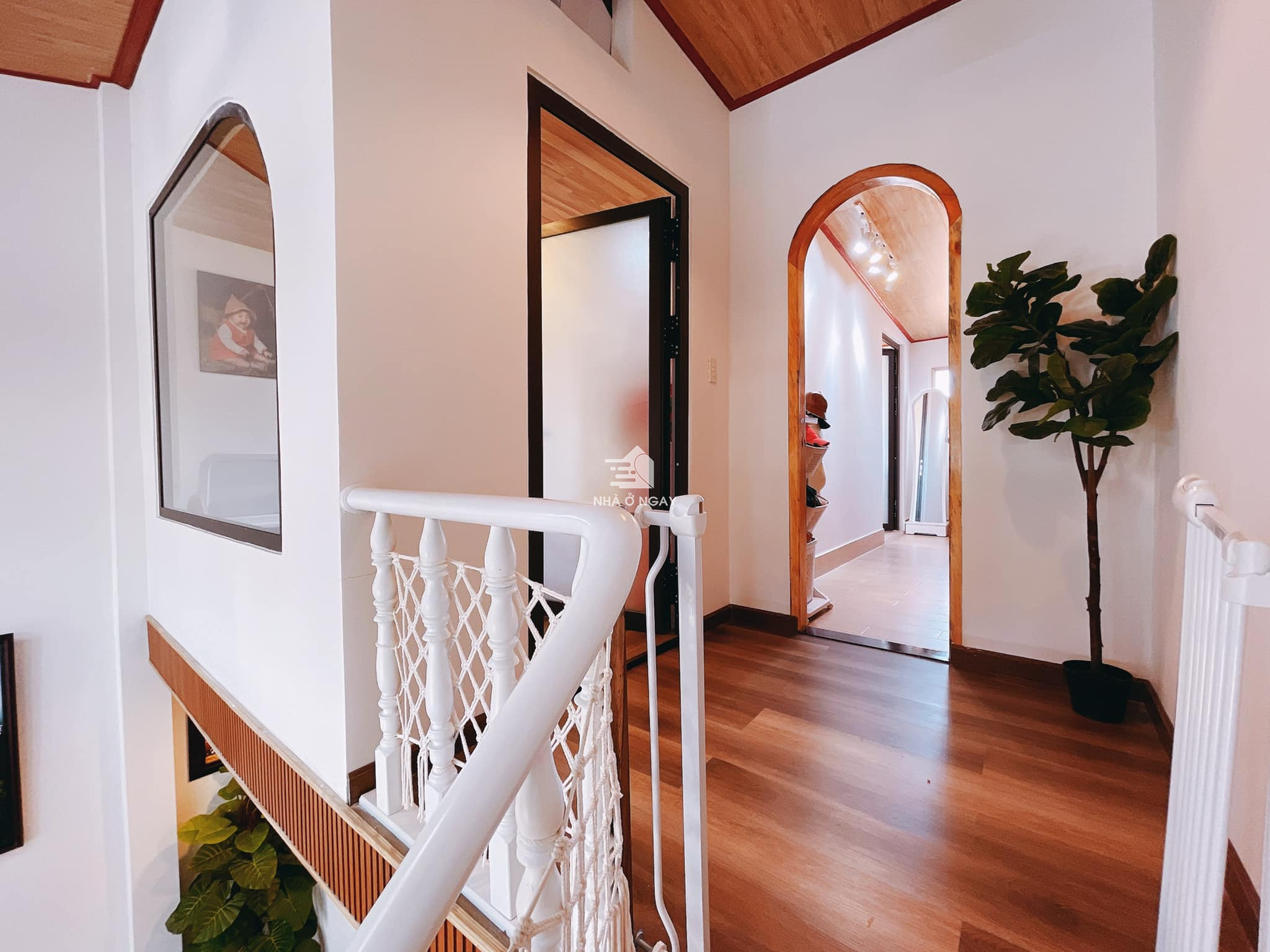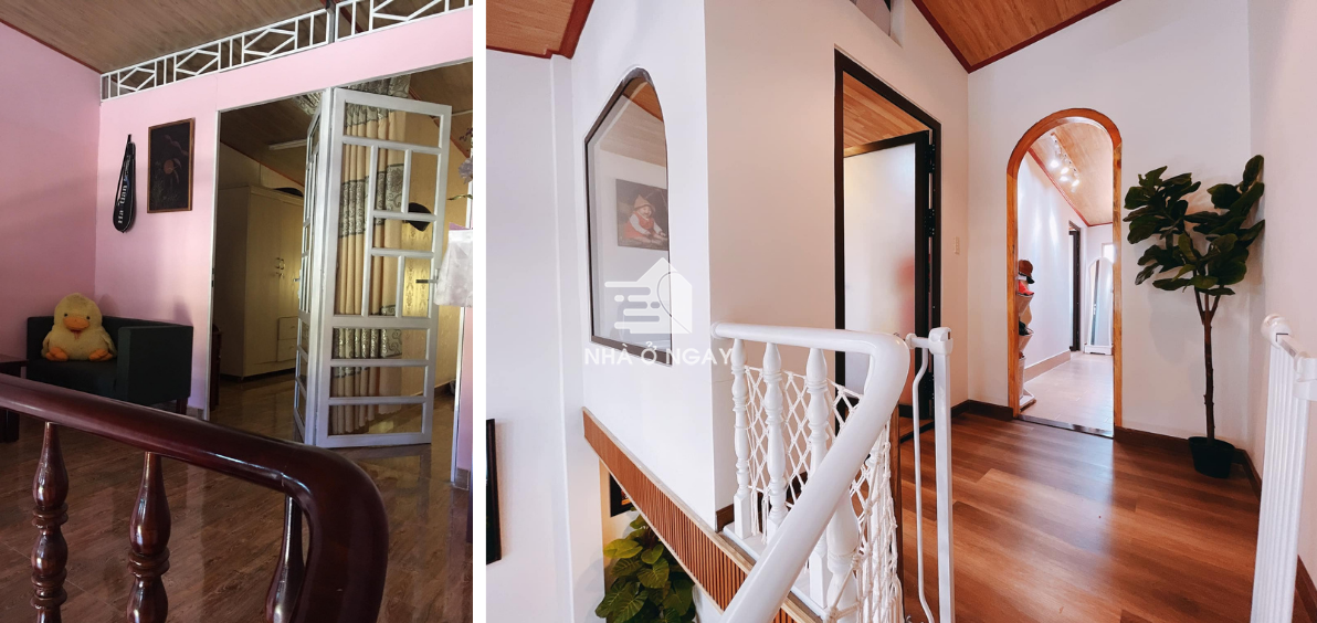 Trước đây, phần gác xép gồm 2 phòng ngủ và để sảnh rộng khoảng 2m. Phần này cũng được gia cố và sắp xếp lại hoàn toàn. Tẩy màu nâu của bậc thang cũ, sơn trắng cho sáng sủa và giữ hoa văn gỗ thông bằng cách sơn bóng.