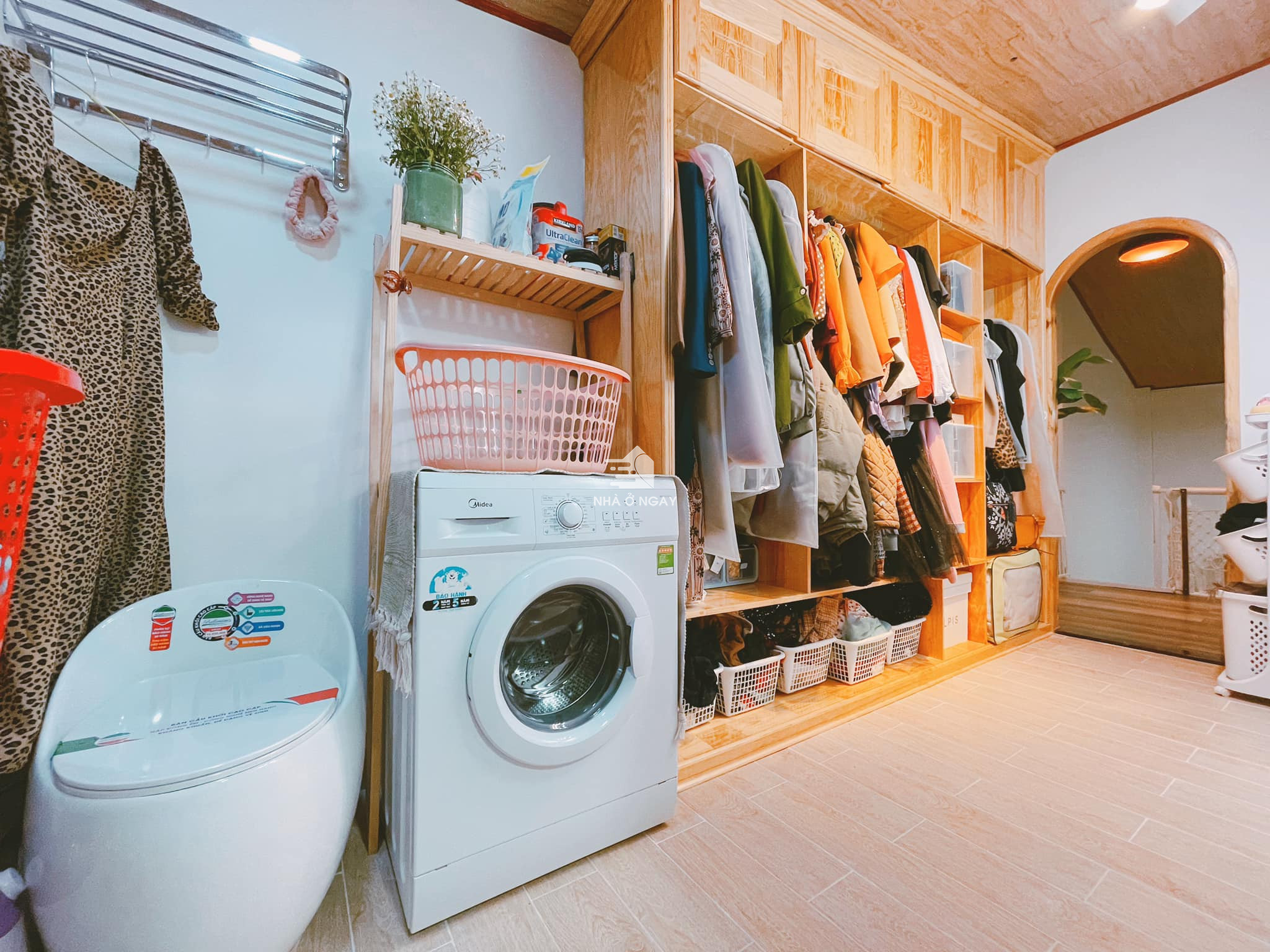 Phòng ngủ phía ngoài được sử dụng làm phòng đa năng chứa quần áo, máy giặt, cửa thông ra ban công phơi quần áo và đặt một bệ toa-lét phụ.