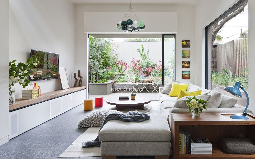 Phòng khách hiện đại với gam màu trắng chủ đạo