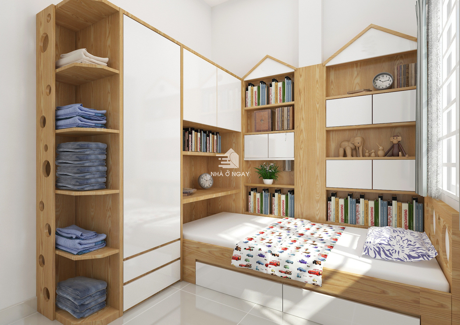 Giường ngủ có ngăn kéo kết hợp tủ quần áo nhằm tận dụng tối đa diện tích sử dụng.